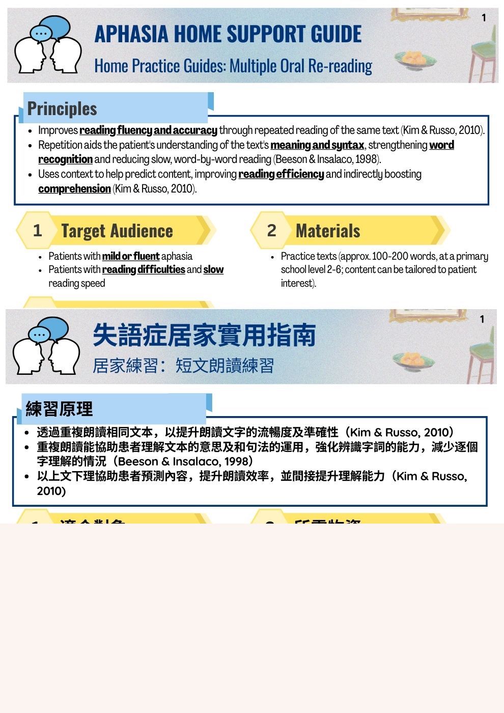 本單張說明了短文朗讀練習技巧。患者反覆大聲朗讀一篇簡短易處理的文章,直到能夠流暢且少錯誤地讀出,這有助於重建閱讀信心和效率。
